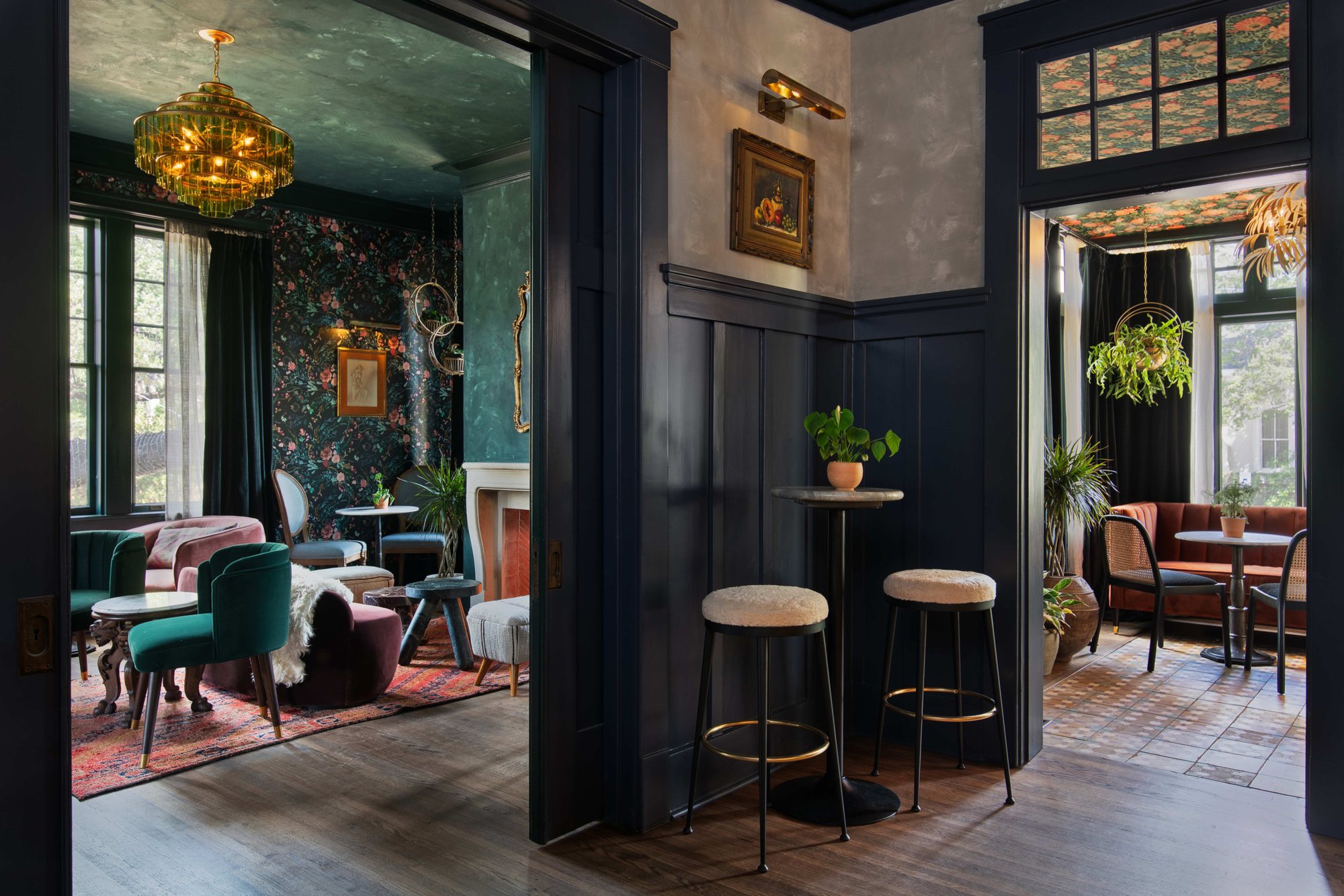 Inside the home, the LV Studio Team chose to contrast the large, bright windows with a dark, moody color palette. The variation of patterns and textures add visual interest to this room, mixing plants, whimsical chandeliers and floral wallpaper with darker-colored seating, paint, and drapes.